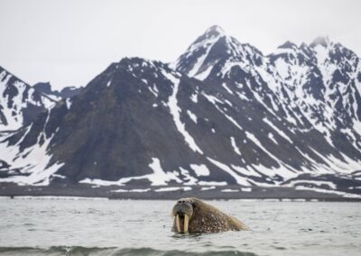 Northwest Svalbard, a National Park since 1973, preserves a rich history of early Arctic exploration and whaling. First visited by William Barents in 1596, the area became a hub for Dutch and English whalers, whose haunting remnants, such as the blubber ovens and graves of young sailors at Smeerenburg, remain visible. Now heavily protected, the region has been reclaimed by nature, hosting Arctic flowers, seabirds, walrus, and polar bears, making it once again a pristine wilderness and haven for wildlife.