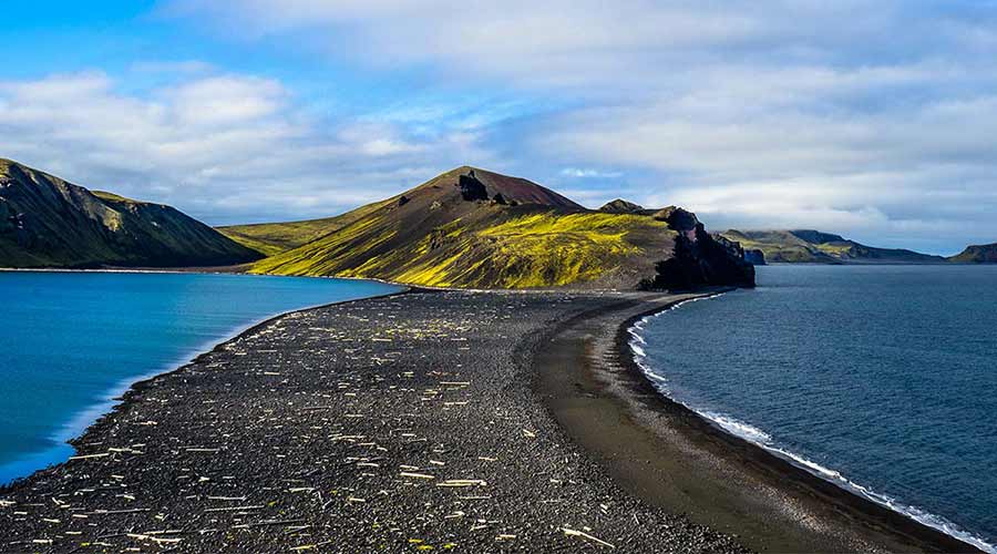 The active volcanic island of Jan Mayen is on the Mid-Atlantic Ridge, the ‘spine’ of the Atlantic Ocean. This enigmatic and isolated island is the only active volcano in Norway, and the northernmost active volcano on Earth. Jan Mayen is inhabited by only around 18 people, a mixture of scientists and Norwegian troops. The volcanic origin is visible all over with cinder cones, lava flows, and the Fuji-esque peak of Beerenberg looming above, while creeping tundra plants and squabbling seabirds eek out a living in the rugged cliffs.